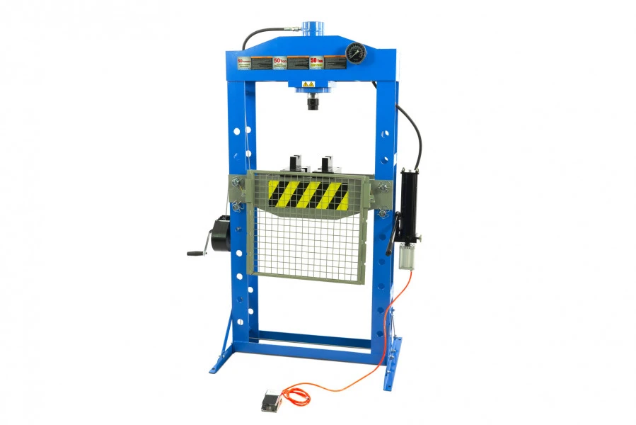 Veiligheid is een belangrijke factor in elke werkplaats en de 50 ton raamwerkpers/werkplaatspers beschikt dan ook over alle nodige veiligheidsvoorzieningen. Naast een pneumatische bediening is het systeem ook uitgerust met een veiligheidsrek, waardoor het risico op ongelukken een stuk kleiner is. Daarbij verplaats je de cilinder van rechts naar links over een maximale afstand van 245 mm, waardoor je ook flexibeler werkt. Ook is het gehele systeem relatief compact, perfect voor opstelling in elke werkplaats.