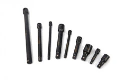De set bestaat uit negen verschillende stukken en is gemaakt van precisie koud gesmeed en gehard chroom-vanadiumstaal. Ieder model uit de set is erg duidelijk afleesbaar en voorzien van lasergegraveerde maten. Daarnaast zorgt de industriële fosfaatcoating voor effectieve bescherming tegen corrosie. Het gat in de zijwand maakt een eenvoudige bevestiging aan het gereedschap via kogelafsluitingsmechanisme of grendelpen mogelijk. Daarnaast is de volledige set specifiek gesmeed voor het gebruik met slaggereedschap. Ben je klaar met het uitvoeren van de werkzaamheden en heb je daarom een van de verlengstukken niet langer meer nodig? Je bergt de complete set eenvoudig op in de meegeleverde case.