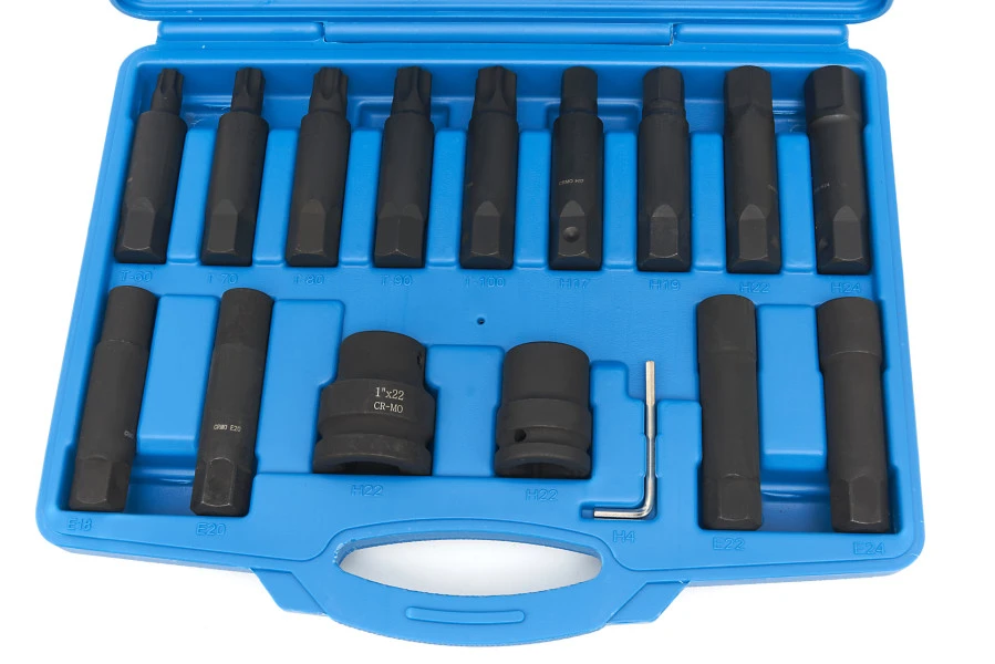 Krachtdoppen gebruik je voor verschillende zaken. Zo kun je de doppen bijvoorbeeld gebruiken om aluminium velgen te beschermen. De doppen komen dan ook uitstekend van pas in vrijwel elke garage. De set bestaat uit Torx, E-torx en Hex krachtdoppen, waarvan de Hex doppen in 3/4 en 1 inch uitgerust zijn. De kracthdoppen worden geleverd in een handige kunststof opbergkoffer, waar elk onderdeel een eigen plek heeft zodat je altijd snel en eenvoudig de juiste dop kunt vinden.