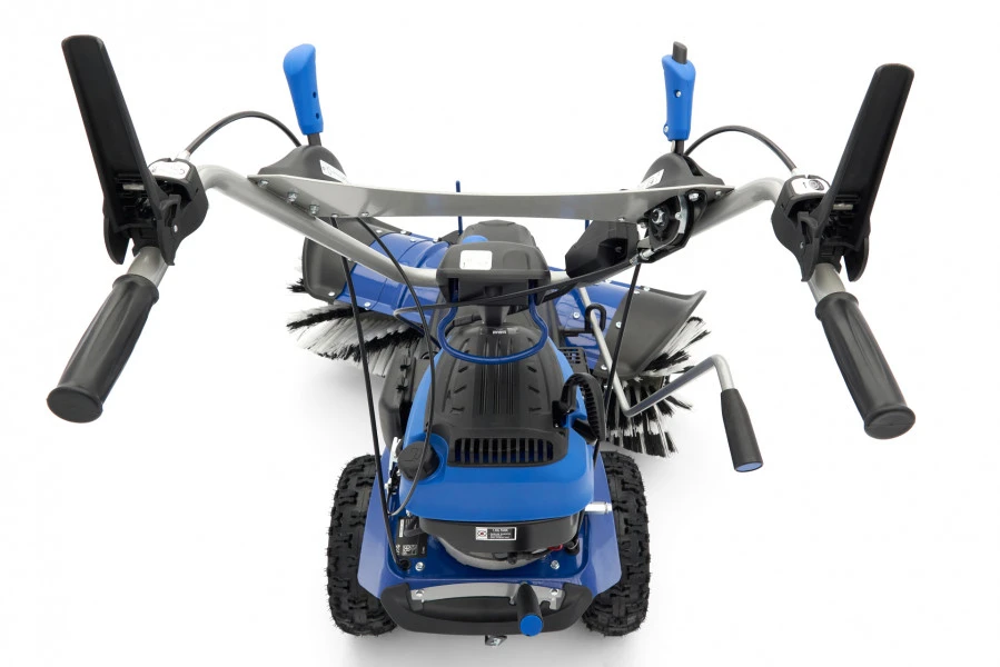 De veegmachine heef een professioneel, stoer design door het gebruik van blauw en zwart op de behuizing. Daarbij zit de borstel goed beschermd door een kunststof kap.